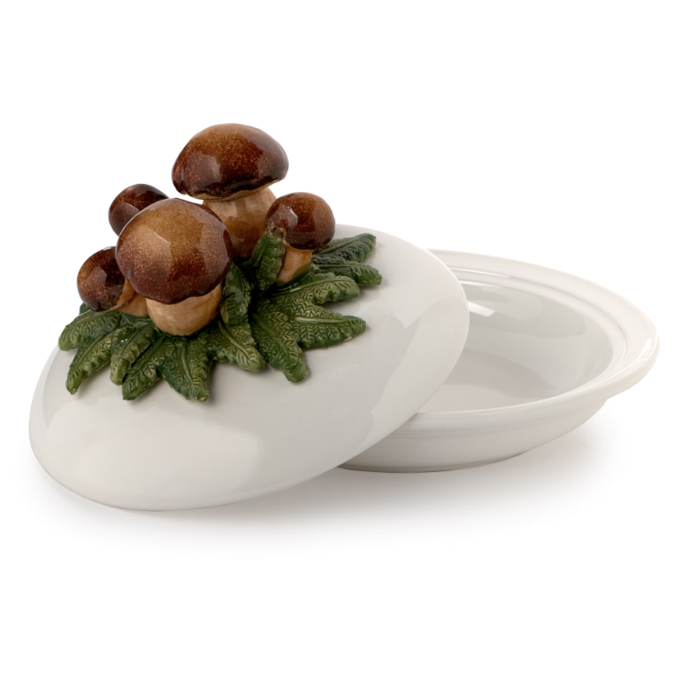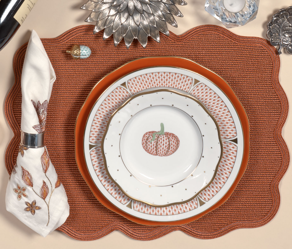 For a warm beginning, serve butternut squash soup or pumpkin bisque in our Soup Plate with Mushroom Lid, paired with a silver soup spoon.