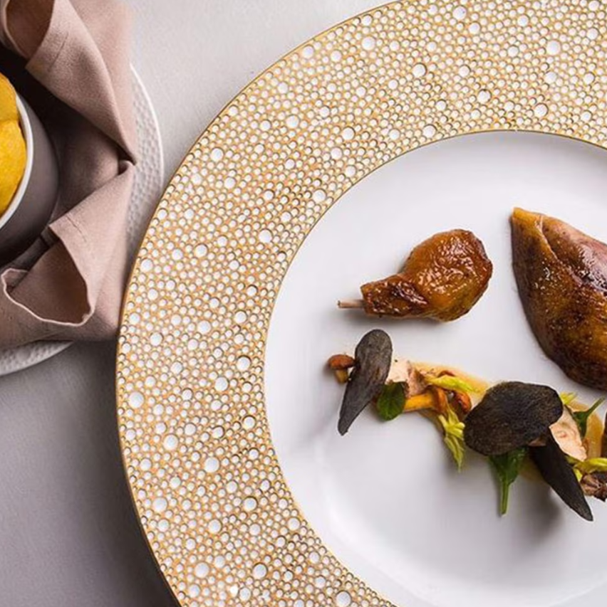 The plates you choose form the canvas of your holiday table. Patterns such as Bernardaud Ecume Mordore bring timeless elegance, while collections like the Royal Crown Derby Sienna Fall Plate or the